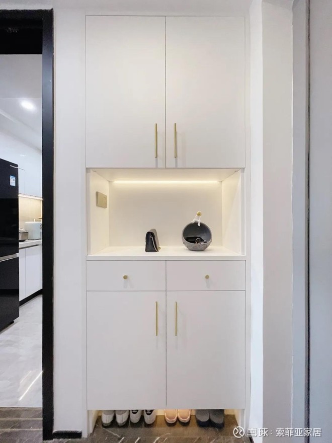 玄关作为屋内屋外的缓冲区,需要满足放鞋换鞋,摆摆装饰,收发快递等等需求,如果不把功能规整好,很容易随手就把门口搞乱了。