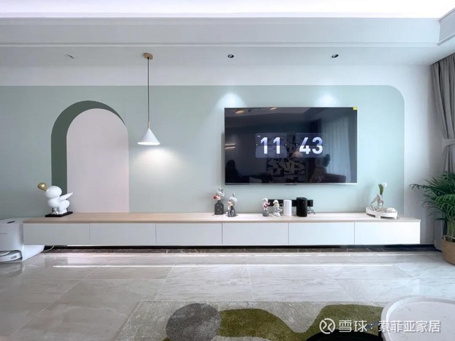 最值得一提的是,业主家客厅选择了索菲亚的定制电视柜,总长约有4.5米,简约又极具特色。业主把照片放上社交平台,很多网友都说这是他们见过的最长的一字型电视柜了。再加上把背景墙刷成了浅绿色,搭配拱门造型,整个客厅颜值提升了几个档次。