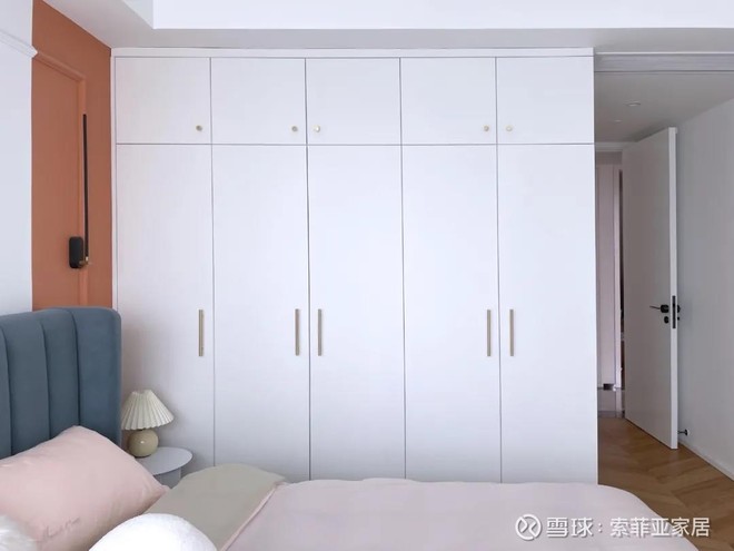 房子的次卧还有一个嵌入式的索菲亚衣柜,同样被网友赞了千百遍。白色的门板搭配金色拉手,带一点金色的点缀,衣柜里面还有灯带设计,方便寻找衣服。