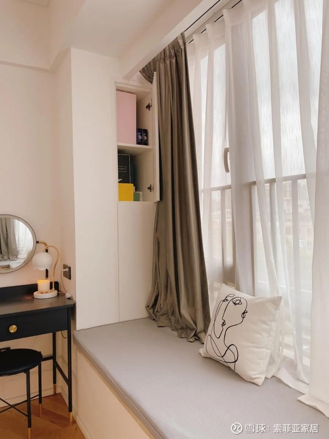 主卧飘窗上还有一个索菲亚的定制内嵌柜,把空间利用到极致。由于飘窗位置面积有限,尺寸有丝毫偏差都无法安装,为此设计师反复修改图纸,确认尺寸,才把柜子完美地安装上,而这样极致的需求也只有专业的定制柜才能实现。