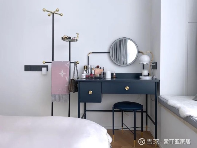 飘窗旁边还摆放了一张梳妆台和挂衣架,金色的点缀带点轻奢风,这里就是业主化妆的小角落了。