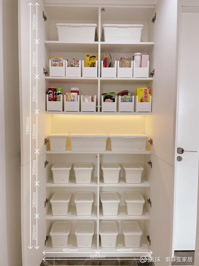 过道储物柜分了两层柜门,采用按压门设计,中间还装了内嵌灯带,晚上打开柜门拿东西,可以照明又可以增加氛围感。收纳柜里面的层板可调节,搭配收纳盒,灵活收纳。