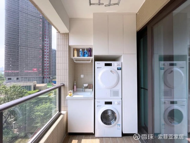 四条木在阳台打造了阳台柜,放置洗衣机、烘干机和日用清洁品,集中收纳使空间更加简洁干净。