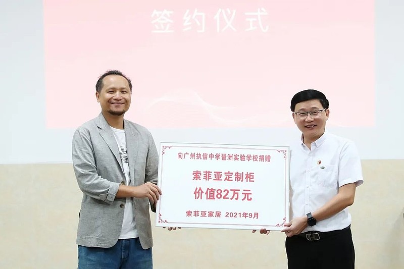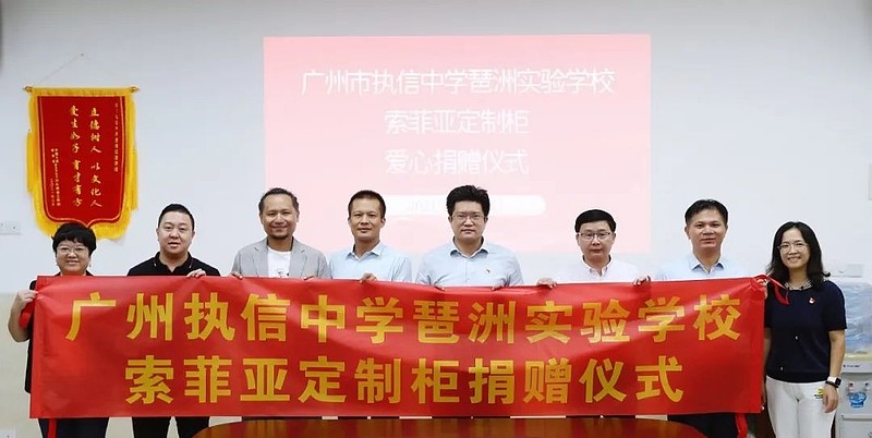 为了表示感谢,9月14日,广州市执信中学琶洲实验学校在校特举办索菲亚定制柜爱心捐赠仪式。广州市海珠区教育局副局长陈颖钊、海珠区教育局装备中心主任陈贤、广州市执信中学琶洲实验学校校长黄培杰、副校长何志华、副校长郑丽明、索菲亚集团品牌部品牌总经理王梦醒、集团设计中心总经理黄小棵,集团品牌部公关室刘建明等出席捐赠仪式。
