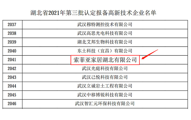 近日,国家科技部火炬中心公布了湖北省2021年第三批高新技术企业公示名单,索菲亚家居股份有限公司全资子公司——索菲亚家居湖北有限公司入选,获得“高新技术企业”称号。